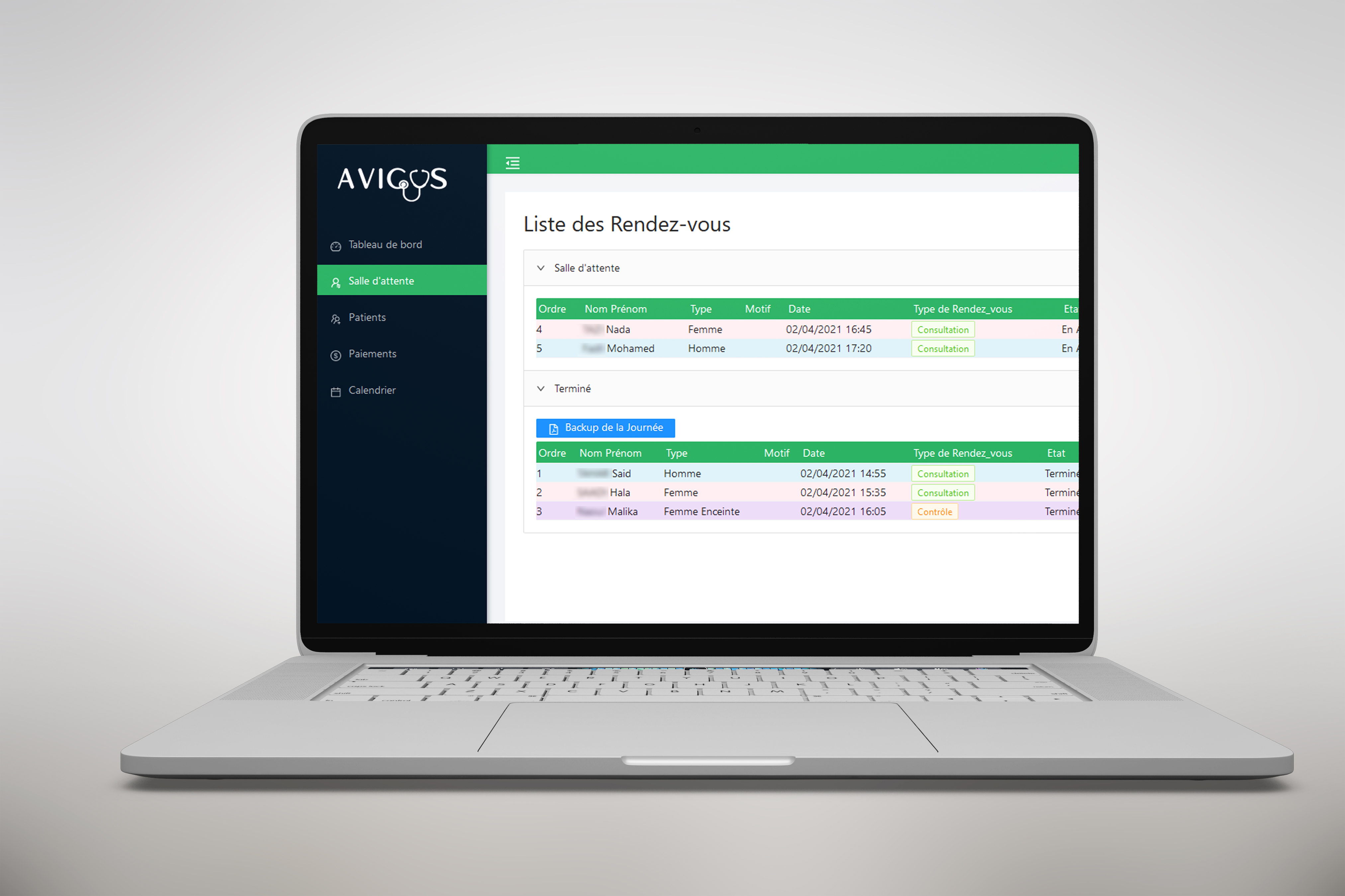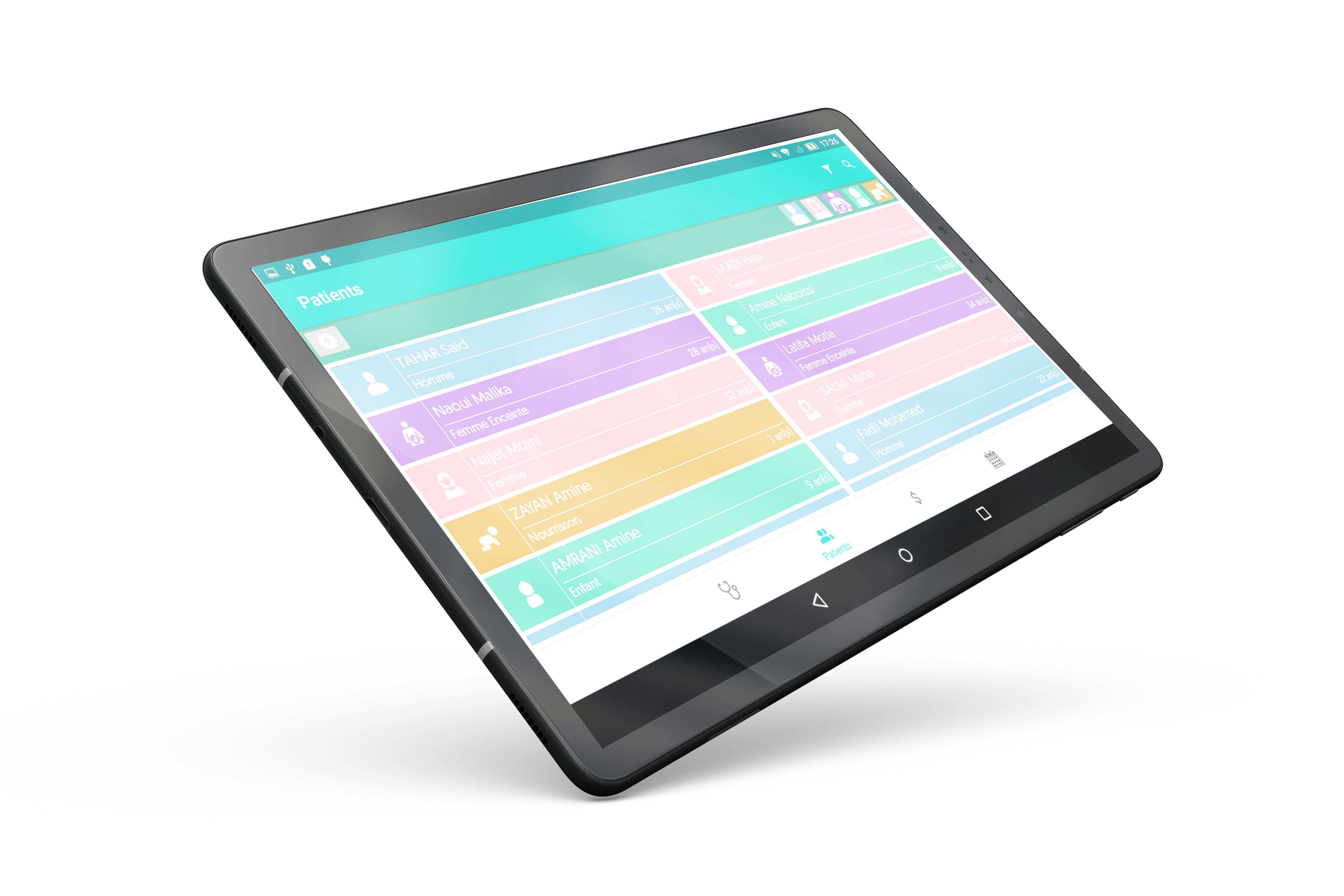 • Application mobile pour l'assistante (enregistrement des patients, paiement, constantes)